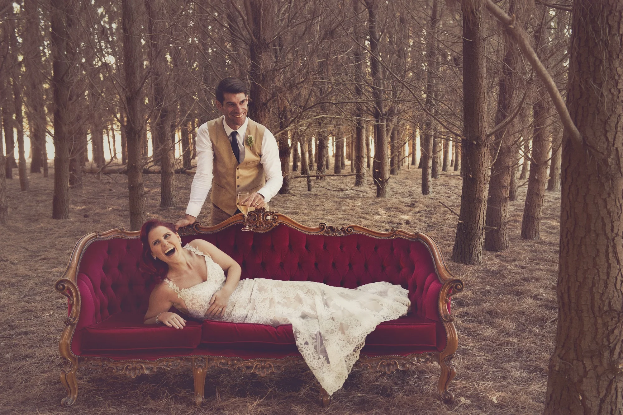 Chris and Steph hired a few luxe, antique couches for their reception from Vintage Scene Hire to contrast against the rustic Hayshed at Barristers Block. Old school glamour!