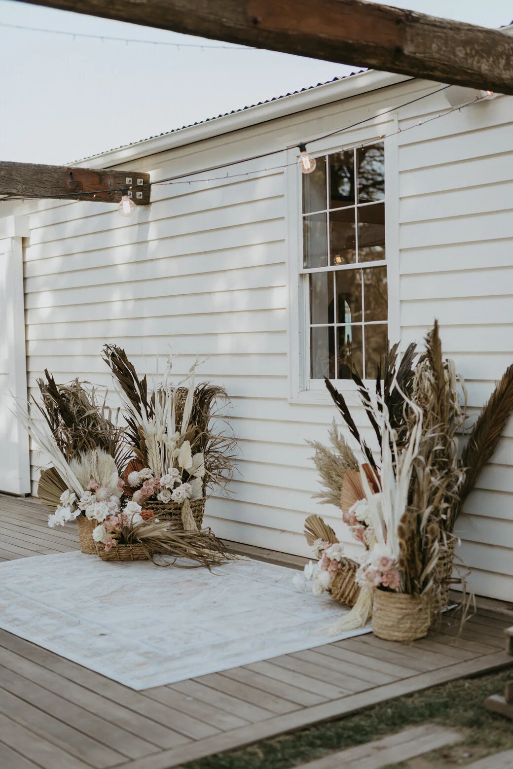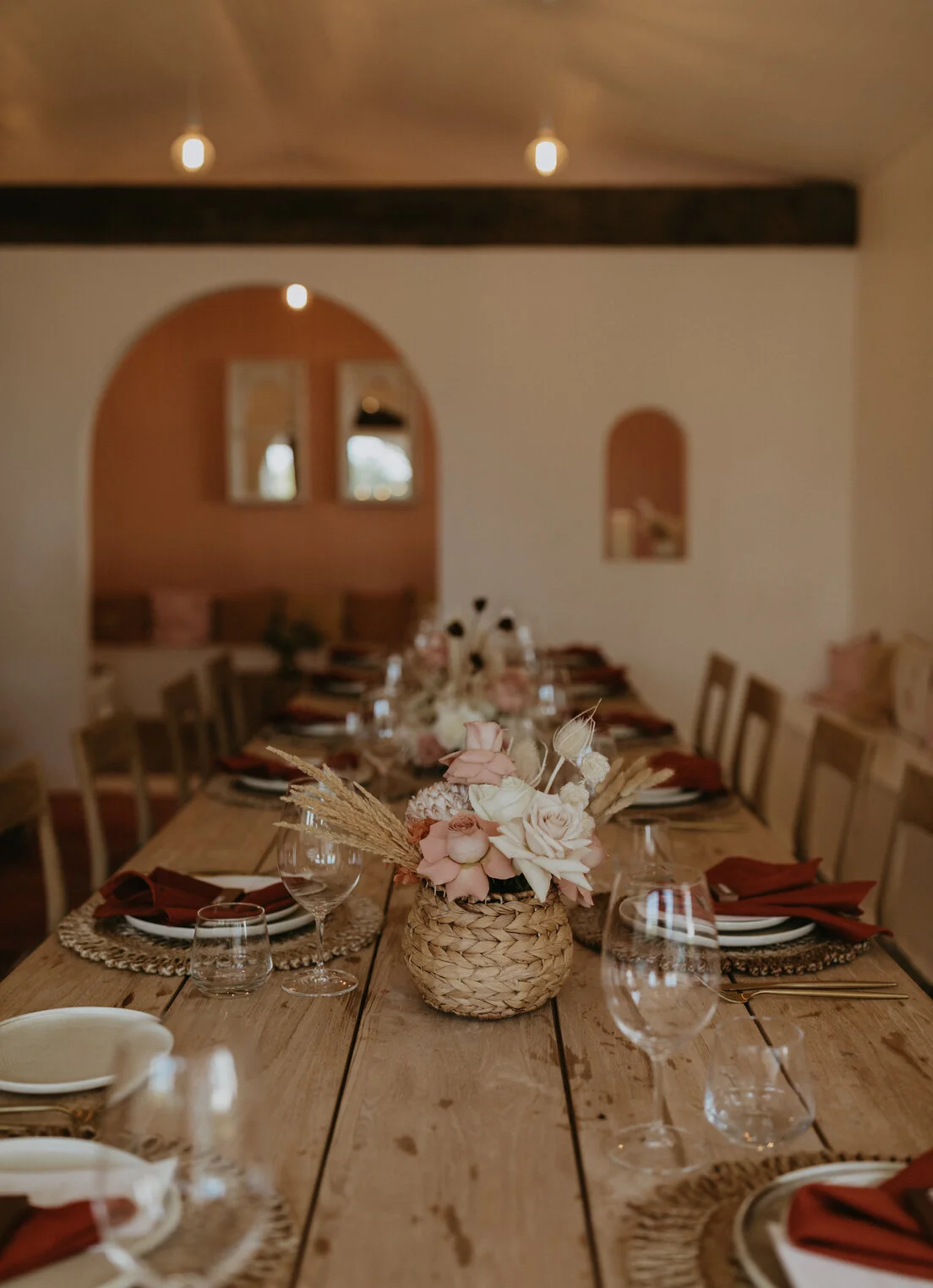 A stunning colour palette featuring terracotta red linen napkins, reflexed blush roses, dried foliage and worn wicker baskets came together to create a dream-like atmosphere for Peter, Alana and their 10 very special guests.