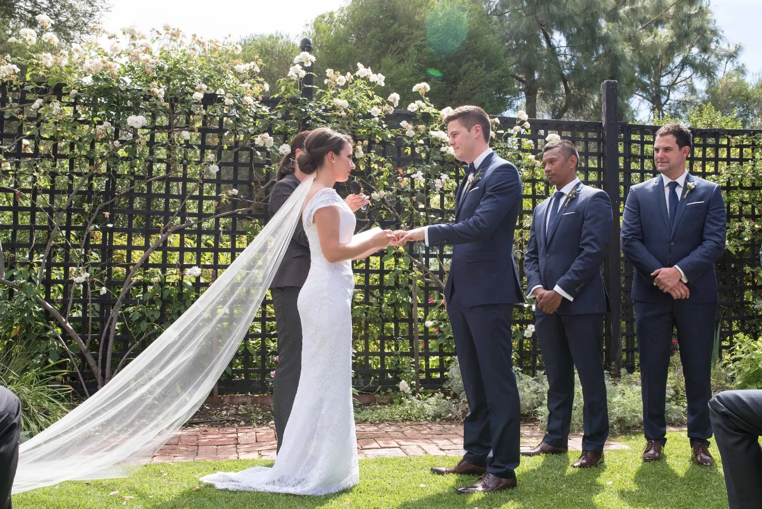After their inclusive and moving ceremony in the rose garden, guests made their way through the sumptuous gardens of Al-Ru Farm to the main lawn where they enjoyed pre-reception drinks and canapés. Lawn games and acoustic guitarist, Israel Amoy, provided the entertainment until the guests were ushered into the regal and elegant reception.